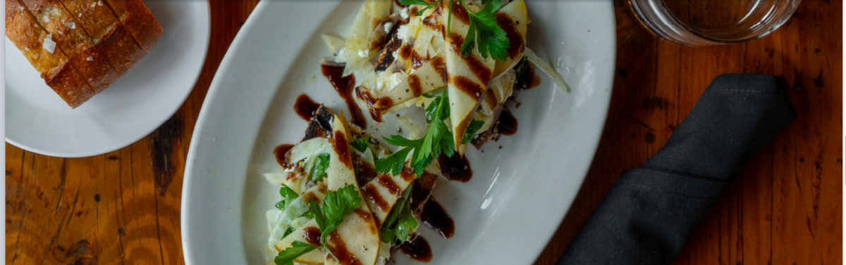 Whipped Goat Cheese, Red Wine-Candied Shallots, Local Peaches, Fennel, Herbs and Balsamic Glaze. VEG